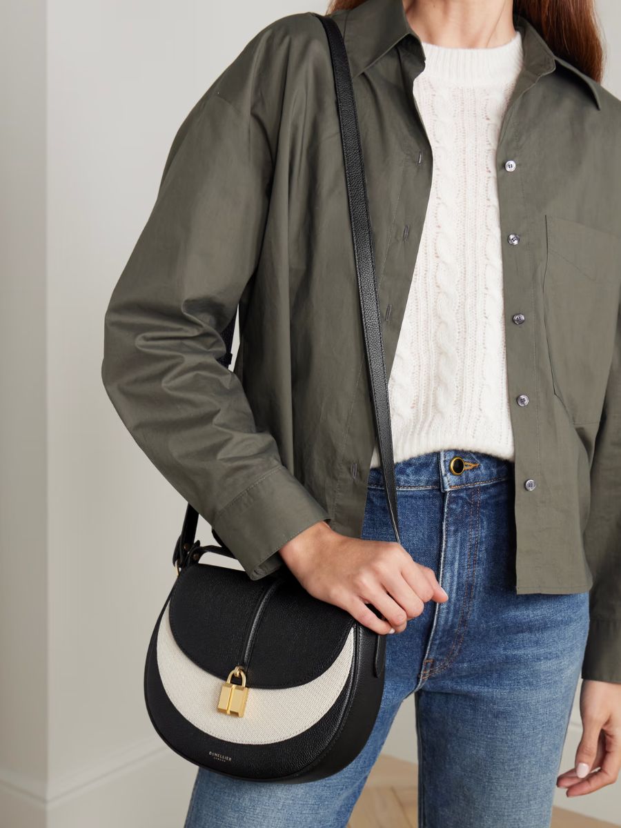 The Siena Saddle from DeMellier is handmade from structured canvas and smooth leather, finished with bold gold-tone hardware and the brand’s signature stamped logo. A polished everyday bag that pairs effortlessly with tailored coats, denim, or relaxed knits, bringing a touch of quiet luxury to any look.