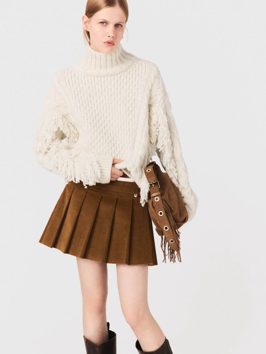 A statement knit that combines warmth with texture. This cable-knit sweater features a ribbed high neck and soft, loose fit, elevated by fringe detailing along the sleeves that adds subtle movement and character. Balance it with denim for everyday ease.